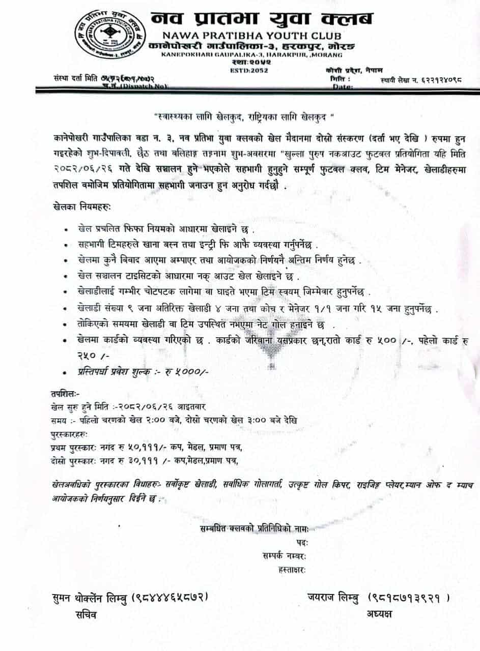 नव प्रतिभा युवा क्लबद्वारा आयोजित प्रतियोगिता असोज २६ आइतबारदेखि कार्तिक २ गतेसम्म सञ्चालन हुने क्लबका सचिव सुमन थोक्लेंन लिम्बूले बताए । स्वास्थ्यका लागि खेलकुद, राष्ट्रका लागि खेलकुद भन्ने मूल नाराका साथ सुरु हुन लागेको प्रतियोगिताको प्रथम पुरस्कार ५० हजार १ सय ११ रुपैयाँ र दोश्रो पुरस्कार ३० हजार १ सय ११ रुपैयाँ सहित कप, मेडल र प्रमाणपत्र रहेको लिम्बूले जानकारी दिए ।